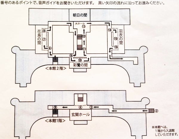 玄関ホールから2階へ、花鳥の間から見学スタート。 |