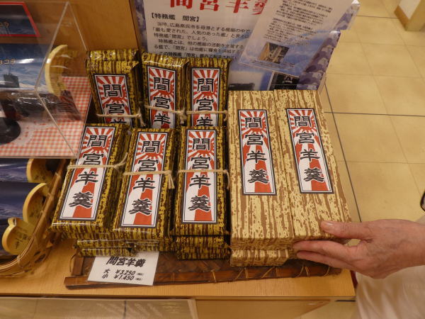 横須賀中央駅は小泉元首相の自宅がここから徒歩圏内にあるらしい。先日婚約した進次郎君と滝川クリステルご夫婦もこの駅は馴染みなのだろうか、などと思いを馳せながら、大降りの雨の中を駅前大通りを進む。目的の「横須賀軍艦カレー本舗」はほんの数分で到着。レストランは開店準備中だったので、一階の直営土産物店をのぞきながら開店を待つ。 横須賀軍港らしく店頭には海軍関連グッズが並んでいる。 「間宮羊かん」第二次世界大戦の頃、日本海軍の給糧艦『間宮』の艦内で製造された羊かんだそうだ。 |
