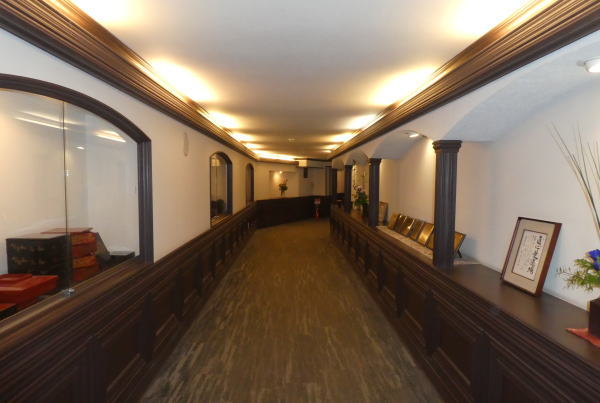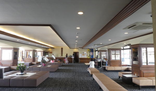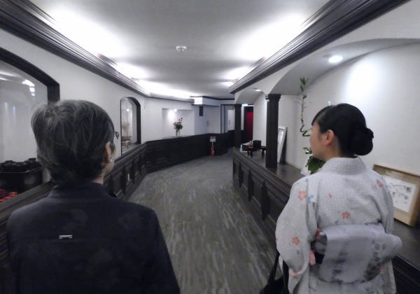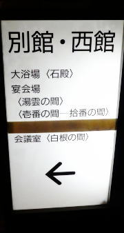 説明を受けていた大浴場は別館の3階。西館のエレベーターで一階におりて別館へ。そこは別館の5階で別館エレベーターに乗って3階に降り直ぐ左に大浴場。左が男湯、右に女湯。暖簾をくぐって入る。 |