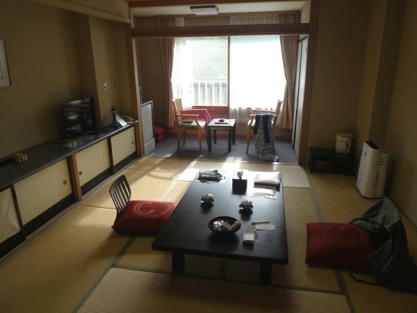 本館から7〜8分かかってやっと部屋に到着。係の仲居さんから館内説明があってお茶を入れてもらって、浴衣は特大をお願いする。すぐお風呂に行きたいので特急でとお願いするとほんのすぐに届けてくれた。近くに備品のストック場所があるのだろう。