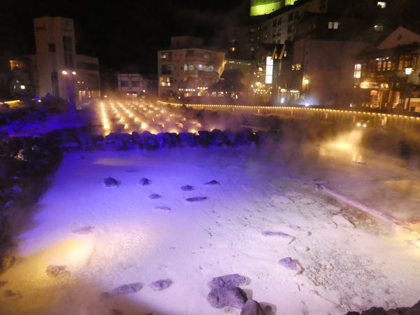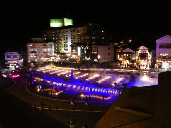 ホテル一井の一階は土産物店で夜も賑やか。階段を上がり2階がロビーでロビーから続く大バルコニーは真下に湯畑の夜景がひろがりなかなかのパノラマ展望台となっている。 |