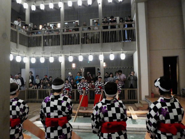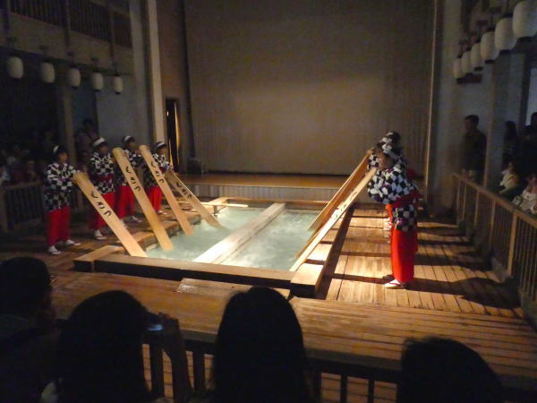 1.2階の客席はほぼ満席。16:30〜湯もみショー開演。 浴衣姿の司会者が開始の挨拶に続いて、草津温泉の歴史のムービーショーがあり草津節踊りが始まる。 |