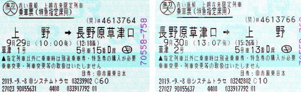 | 往き29日上野駅10:00発 帰り30日13:07長野原草津口駅発 |
