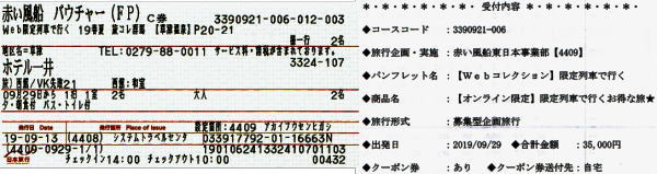 手配した日本旅行「ホテル一井に宿泊.往復交通費込みプラン」 二人で税込35000円で予約。