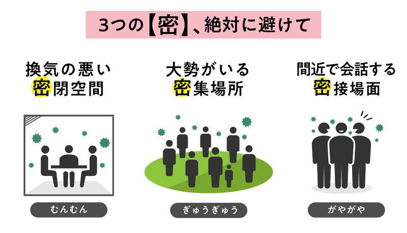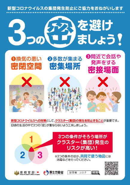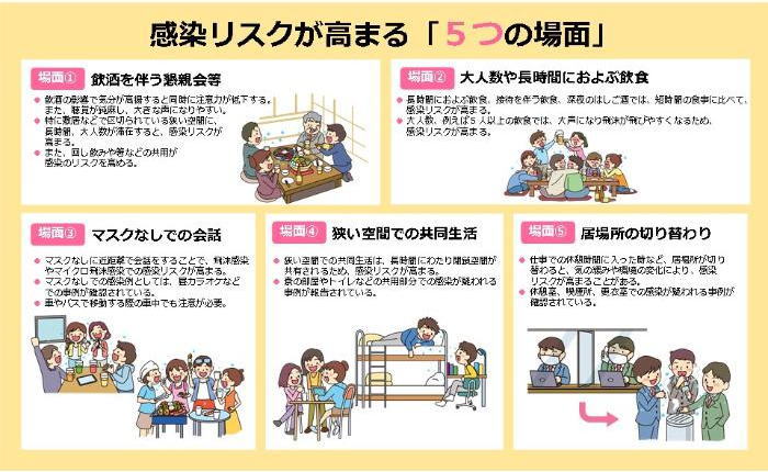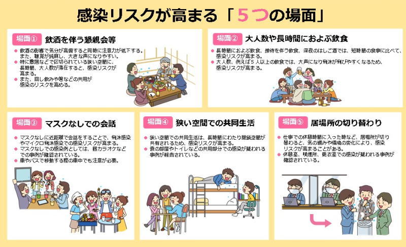 ![]() 【図1】感染リスクが高まる「5つの場面」(厚生労働省ホームページより) |