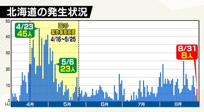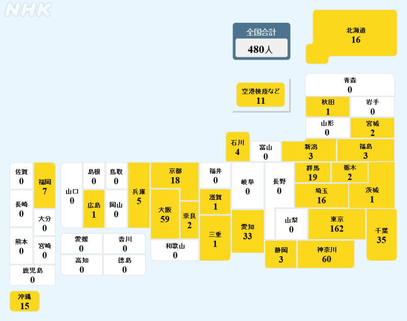 【国内感染】新型コロナ 26人死亡 最多2972人感染(午後10時半) 2020年12月10日はこれまでに全国で2972人の感染が発表されています。 また大阪府で9人、北海道で5人、東京都と愛知県、岩手県でそれぞれ2人、京都府、兵庫県、埼玉県、宮崎県、茨城県、佐賀県でそれぞれ1人の合わせて26人の死亡の発表がありました。 国内で感染が確認された人は、空港の検疫などを含め17万2416人、クルーズ船の乗客・乗員が712人で、合わせて17万3128人となっています。 亡くなった人は国内で感染した人が2513人、クルーズ船の乗船者が13人の合わせて2526人です。 各自治体などによりますと国内で感染が確認された人は、累計で次のとおりです。 ( )内は10日の新たな感染者数です。 ▽東京都は4万5529人(602) ▽大阪府は2万3835人(415) ▽神奈川県は1万4313人(214)▽愛知県は1万2137人(242) ▽北海道は1万805人(241) ▽埼玉県は9913人(188) ▽千葉県は7827人(151) ▽兵庫県は6998人(149) ▽福岡県は6343人(79) ▽沖縄県は4702人(46) ▽京都府は3076人(54) ▽静岡県は2085人(45) ▽茨城県は1911人(19) ▽群馬県は1526人(44) ▽宮城県は1417人(38) ▽岐阜県は1381人(45) ▽奈良県は1378人(24) ▽広島県は1327人(70) ▽熊本県は1170人(27) ▽三重県は1011人(25) ▽長野県は892人(29) ▽石川県は888人(4) ▽滋賀県は847人(5) ▽栃木県は822人(22) ▽鹿児島県は771人(30) ▽岡山県は702人(13) ▽宮崎県は578人(5) ▽福島県は565人(7) ▽和歌山県は538人(10) ▽大分県は464人(25)▽富山県は464人(2) ▽山梨県は440人(3) ▽山口県は427人(5) ▽新潟県は374人(5)▽佐賀県は367人(13) ▽青森県は358人(4) ▽愛媛県は354人(1) ▽福井県は331人(2) ▽高知県は301人(20) ▽長崎県は290人(12)▽岩手県は230人(5) ▽山形県は211人(15) ▽香川県は199人(3) ▽徳島県は187人 ▽島根県は165人(7) ▽秋田県は90人 ▽鳥取県は67人です。 このほか、▽空港の検疫での感染は1637人(7)、▽中国からのチャーター機で帰国した人と国の職員や検疫官などの感染は合わせて173人です。 厚生労働省によりますと、新型コロナウイルスへの感染が確認された人で、人工呼吸器や集中治療室などで治療を受けるなどしている重症者は、10日時点で543人(-12)となっています。 一方、症状が改善して退院した人などは、10日時点で、▽国内で感染した人が14万3006人、 ▽クルーズ船の乗客・乗員が659人の合わせて14万3665人となっています。 また8日には速報値で1日に3万3345件のPCR検査が行われました。 |
