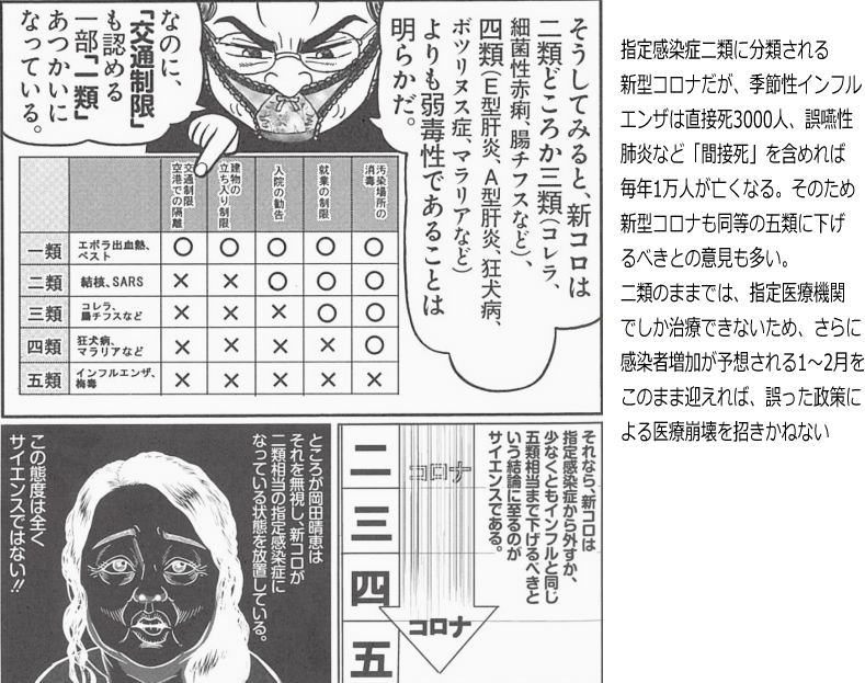 | 小林よしのり氏「わしを『モーニングショー』に呼んで」TVが言わないコロナ論 12月17日、東京都は医療提供体制を4段階の警戒レベルのうちでもっとも深刻な「逼迫」に引き上げた。前日の16日には新型コロナウイルス感染症の新規陽性者数が過去最多の822人を記録。23日も748人と高い水準で推移している。日本国内の死者は累計3050名(12月24日、厚生労働省)となるなど、全国レベルで見ても「コロナ第3波」の猛威はさらに勢いを増していると言っていいだろう。 「経済を最優先すべき」と持論を唱える小林よしのり氏 メディアでも連日、「医療崩壊」の危機が報じられ、15日には菅義偉首相が「Go Toトラベルキャンペーン」を全国一斉に一時停止することを決めたが、この政府による突然の方針転換について「批判の声に屈せずGo Toを続けるべきだった。専門家とメディアが言うような『医療崩壊』は起きない」と持論を唱えているのが、漫画家の小林よしのり氏だ。 「コロナ感染抑止」と「経済を回す」、両方やらねばならないのは誰しもわかっているが、比重のかけ方は専門家の間でも分かれる。その中で、もっとも「経済」側に軸足を置いているのが小林よしのり氏なのだ。 直近4か月の間に、『ゴーマニズム宣言SPECIAL コロナ論』『コロナ論2』(扶桑社、現在累計10万部)や『新型コロナ――専門家を問い質す』(光文社)を立て続けに出版。このほか、自身が主催し全国に門下生を持つ「ゴー宣道場」やブログ、YouTubeチャンネルなどで日々コロナを巡る情報発信を行っている。「経済を最優先すべき」と主張する理由は何なのか、小林氏に話を聞いた。 「日本の医療は崩壊しない」と主張する根拠とは? ――医療崩壊の危機が、連日報じられている。 小林:ここにきてGo Toトラベルの一時停止など、医療崩壊を防ぐという名目で経済活動が次々に止められている。だが、重症者の数が全国で600人程度に増えようとも、日本の医療が崩壊するわけがない。 現在、医療が逼迫している最大の要因は、コロナを今もなお指定感染症の「二類」(一部は一類)扱いにしているからに尽きる。季節性インフルエンザより遥かに弱毒性で感染力も低いのに、SARS(重症急性呼吸器症候群)やMERS(中東呼吸器症候群)などの「二類感染症」相当に指定したことで、軽症者や無症状者にまで入院勧告や強制入院など過剰な措置がとられているのを見れば明らかでしょう。 確かに、(12月16日時点で)新型コロナの対応ベッド数は全国で2万7235床しかなく、入院者数の割合は37%まで上昇(※)しているが、「二類相当」から新型コロナを除外すれば、もともと世界一の病床数を擁する日本は160万床でコロナに対応できるようになる。インフルと同等の「五類」扱いにすれば、病床の逼迫など瞬く間に解消しますよ。 医師の約67%が「二類相当の扱いは、見直すべき」 <自治体のなかには、指定感染症「二類相当」の弊害を改める動きも出てきている。12月7日、神奈川県は医療崩壊を防ぐために、新型コロナウイルスの入院者数を抑えて、年齢や病状などを点数化して医師が入院の是非を判断する新基準を導入。従来は、65歳以上の高齢者や特定の疾患を抱える人などは、たとえ無症状でも原則全員が入院となっていたが、これも新型コロナが「二類相当」とされていたからだ。県は「この基準により、新たに入院する人を半分程度に抑えられるのではないか」と説明している。> ――だが、日本医師会の中川俊男会長や東京都医師会の尾﨑治夫会長は「医療崩壊」の危険が高まっていることから、Go Toトラベルの即時中止を訴えていた。今回の新規陽性者の増加を受け、中川氏は「新型コロナウイルスに年末年始はない。クリスマスも『サイレント・ナイト』でお願いしたい」とも念押ししている。 小林:わしの読者には医療関係者もいるが、コロナ患者を受け入れていないかかりつけのクリニックなどで働く者はみな、コロナ前に比べて80~65%まで現場の稼働率が下がり、むしろ「仕事が暇になっている」と嘆いている。これは、コロナが二類感染症相当とされたことの弊害で「発熱患者の受け入れ拒否」が常態化しているからでしょう。彼らは「コロナはインフルより弱いのだから、私たちが受け入れたい」とまで言って、協力を申し出ていますよ。 <日本最大級の医療従事者専用サイト「m3.com」が医師ら884人を対象にした調査(8月28日~9月2日調査)によれば、医師の66.7%は、新型コロナへの感染防護はあまりに過剰で「見直すべき」と回答(「見直す必要はない」は15.8%)。自由回答のなかには、「現在実施している対策は、二類というよりエボラ相当です(リネンの扱い、ご遺体の扱い、使用する防護用具など)。高齢者や基礎疾患のある方が重症化するリスクは、インフルエンザでも同じです。個人的には、いずれ五類季節性インフルエンザ相当が適当と考えています」(看護師)といった声まであった。> 医師会から「二類相当」を見直す動きは出てこない ――ただ、コロナを季節性イ