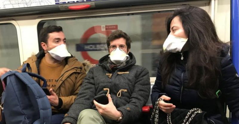![]() ロンドンの地下鉄でマスクをつけた人たち |
