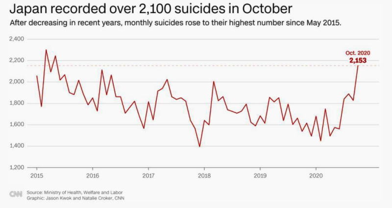 ![]() 近年、日本の自殺者数は減少傾向にあったが、20年10月は2100人を超え5年前の水準に戻った |