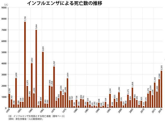 2018年までの日本におけるインフルエンザによる死亡者数 |