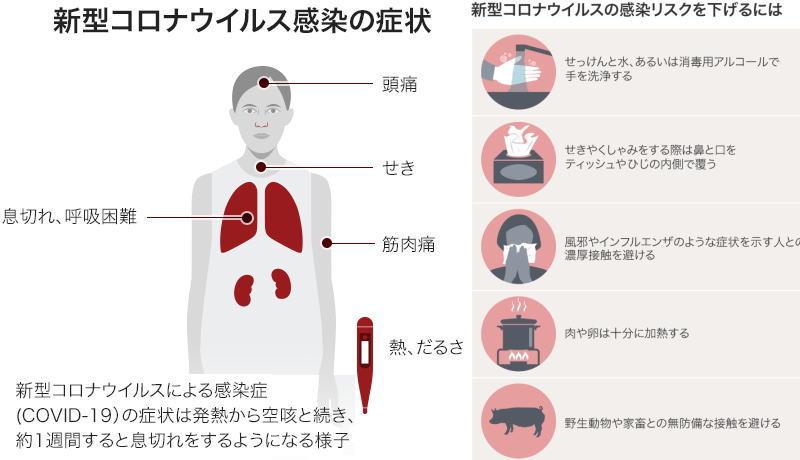 | 6. 感染リスクを減らすには WHOは集団感染が起きた地域の人たちに、手洗いの徹底、せきやくしゃみをしている人から少なくとも1メートル離れることなど、ウイルス感染を防ぐための方法を推奨している。 WHOは特に、呼吸器系の感染症で重症の人と接触したり、病気の人やその周辺と接触した場合は手をよく洗うよう呼びかけている。加えて、家畜や野生動物に直接触れることも避け、食事では動物性食品を生や半生で食べないよう推奨している。 未発症の人でも感染力のあるケースはあるかもしれないが、現状では症状の出ている人が、ウイルス拡散の主な原因になっているというのが、WHOの見解だ。 それだけに、症状の出ている人は「せきエチケット」を励行し、周りの人から一定の距離を保ち、せきやくしゃみをする際にはティッシュで口と鼻を覆い、そのティッシュを捨てるか、ひじの内側で口と鼻を覆うよう呼びかけている。定期的によく手を洗うことも重要だ。 中国をはじめ多くの国では、医療スタッフだけでなく一般市民も感染対策としてフェイスマスクを着用している。 果たして空中のウイルス対策にマスクが有効なのか、感染症の専門家の多くは疑問視する。その一方で、自分の手から口へとウイルスを運んでしまうのを防ぐにはマスクが効果的かもしれないという指摘もある。 中国ではマスクを定期的に取り替えるよう推奨されており、医療スタッフの場合は1日に4回も取り替えるべきだと言われている。このため中国当局は諸外国に、マスク確保に協力してほしいと呼びかけている。 7. 疑わしい場合の手順 中国政府は、新型コロナウイルス集団感染をSARSと同じように分類した。感染者は隔離しなくてはならないし、一定期間、検疫体制下に置くこともできる。 WHOは医療機関のスタッフに対しては、特に救急医療の部門では、通常の感染予防対策を実施するよう求めている。 その上で、患者の状態を速やかに判断し、その病状の程度(軽症・中等症・重症)に応じて治療するよう呼びかけている。 さらに、医療スタッフは防護服を着用し、病院内の患者の移動を制限するなど、感染防止策をただちに実施するよう勧告している。 イギリスでは保健省が新型コロナウイルスを公衆衛生に対する「重大で喫緊の脅威」と宣言したため、イングランド各地の医療当局には市民を隔離する権限が新たに与えられた。 イングランドのクリス・ウィッティー医務主任(CMO)は、イギリスではウイルスの封じ込めと隔離を特に重視していると話す。 イギリス国内では、西部ウィラル半島のアロウ・パーク病院と、中部ミルトン・キーンズにあるケンツ・ヒル・パーク会議場が、「隔離」施設に指定された。 |