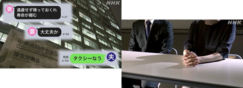 官僚の妻 「本人がどんどん衰弱していくというか。ほおも痩せこけていって。私ともたわいもない話をする余裕すらなくなっています。国民の生活を良くするために働いているはずなのに、自分たちの家庭がどんどん犠牲になっているっていうのが本当につらいですね」 |