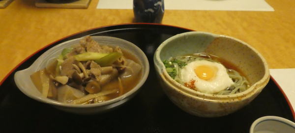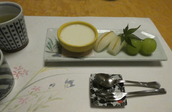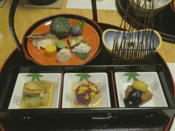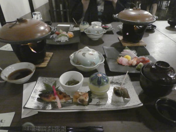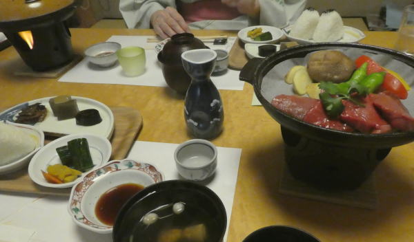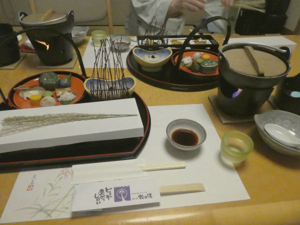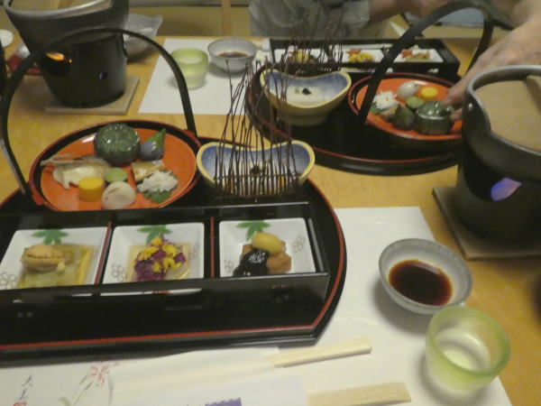 部屋でのんびりしていると電話で夕食の案内。お願いする。 夕食は一階和室で一品一品運ばれる。 |