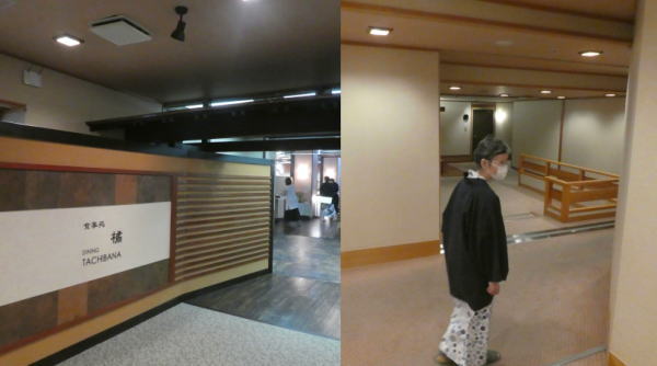夕食は一階レストランで。入口では手をアルコール消毒をして入る。テーブル間隔は広くしてソーシャルディスタンスを考えている。料理はスタッフにより運ばれて、ご飯と芋煮汁は備え付けの手袋をして自分で取りに行く |