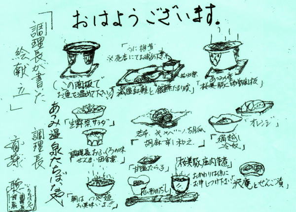 散歩から8時頃宿に戻り、昨夜と同じ食事処で朝食。 |