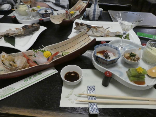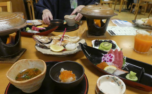 旅館は温泉ではないが大浴場がある。 ゆっくり温まってから夕食会場へ。 |
