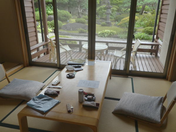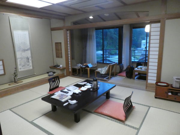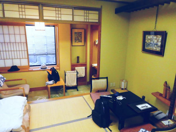 ロビーに用意された浴衣を選んで部屋に案内される。こたつもついた広い部屋。 |