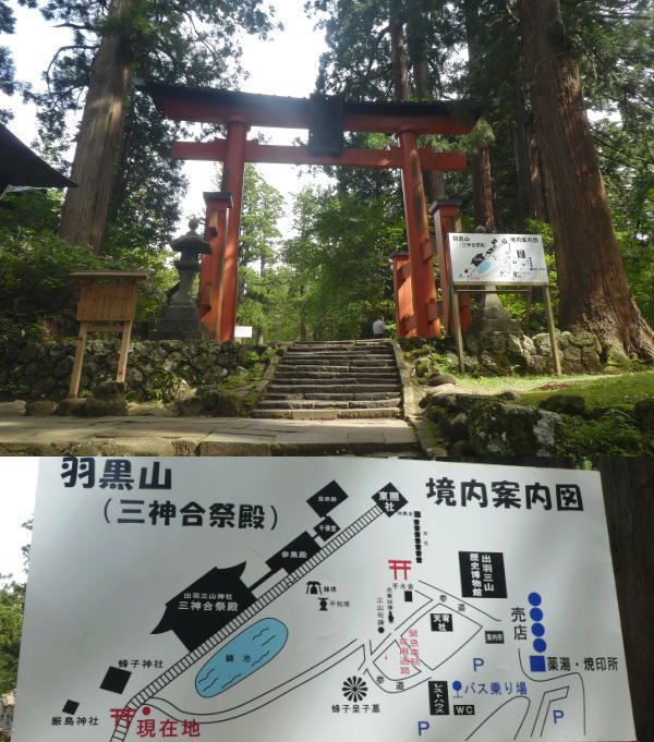 2446段の参道の石段の尽きるところ、羽黒山(出羽三山神社)入口の朱の鳥居 前に到着。 鳥居の手前の坂を十五童坂といい、左に一山の貫主の住んだ執行寺跡があった。 |