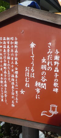 昭和10年3月夫の鉄幹を亡くし傷心の与謝野晶子は、7月にあつみ温泉を訪れ「さみだれの 出羽の谷間の朝市に 傘して売るは おほむね女」の歌を残している。 |