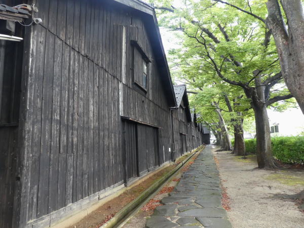 ![]() 山居倉庫 裏側の通りは、日よけ、風よけのためのケヤキ並木 |
