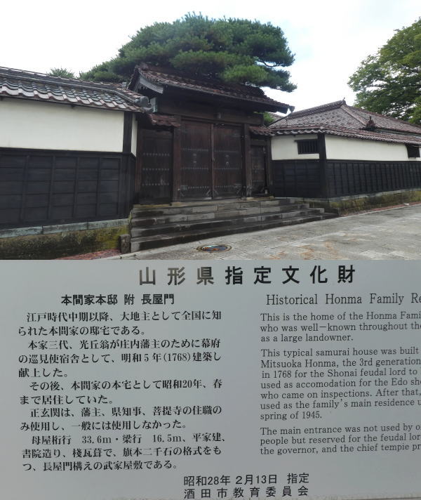山居倉庫見学のあと、倉庫から続く石畳の道を辿って、本間家旧宅を見学へ。 本間家旧邸は、本間家三代光丘が幕府の使一行を迎えるための宿舎として明和5年(1768)に新築、庄内藩主酒井家に献上した、二千石格式の長屋門構えの武家屋敷。 |