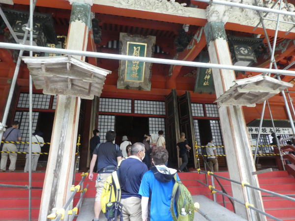 本堂外枠の工事中で中央の階段に並んで参拝する。 山上には明治維新まで本坊を始め30余の寺院に肉食妻帯をしない修験者が住み、山のふもとには336坊の妻帯修験者が住んでいた。 |