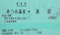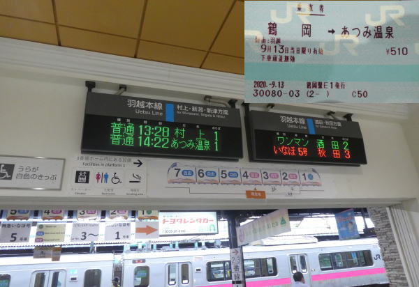 鶴ヶ岡城址公園から鶴岡駅に戻り今夜の宿「たちばな屋」さんに14時頃に駅へ迎えをお願いする。携帯電話がないので、昔懐かしい10円玉で公衆電話を利用。 13:28分、村上行に乗りあつみ温泉へ。 |