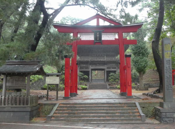日枝神社の石段を上がってお参りする。 神社境内を抜けて日和山公園方面に抜けるた先の、日枝神社鳥居に掲げられた「日枝大神社」の額文字は西郷隆盛によるもの。 |