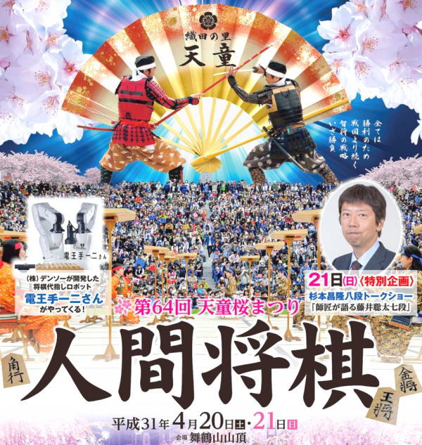 2019年(平成31・令和元年)桜まつり人間将棋の際のゲストは藤井総太さん師匠の杉本八段だった。 |