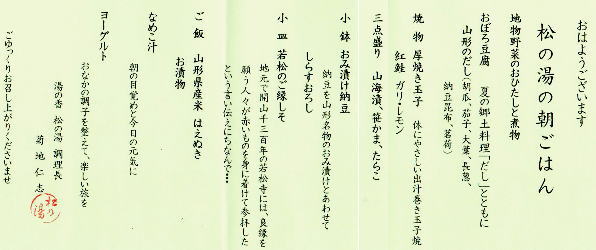 お風呂は男性・女性 二つ。天童温泉では唯一2つの源泉を持つのが宿の自慢。 お風呂で一緒になった方に声をかける。その方は天童市内在住の方で、たまに泊りで来るらしい。「ここは二つ源泉があって一切沸かさず自然ままなので少し熱いという人もいますが、湧き出すままのお湯は貴重ですよ」と言っている「地元の方が入りに来るのは、いい湯というのお墨付きをいただいたようです」と笑いを返す。 |