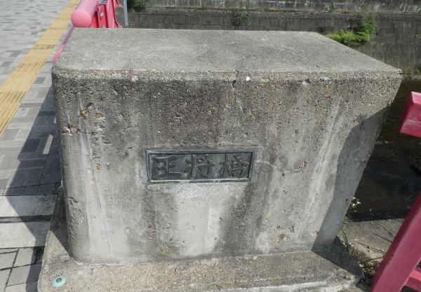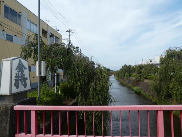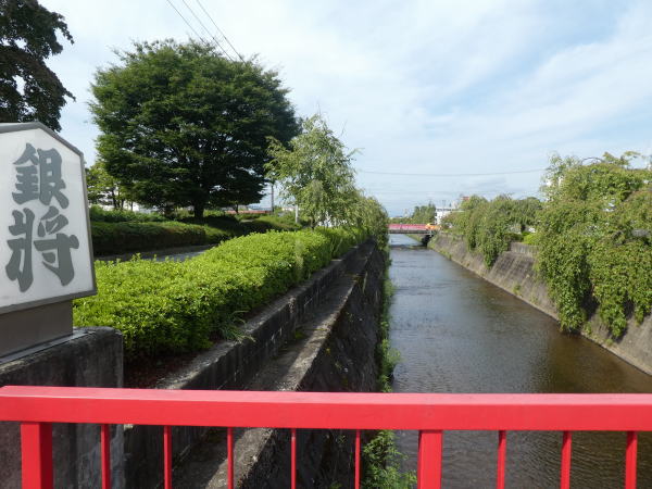 宿を出て天童駅へ、大通りと平行に流れている倉津川沿いの道を歩く 川に架かる橋のたもとには、金、銀、王将など大きな将棋の駒が並ぶ |