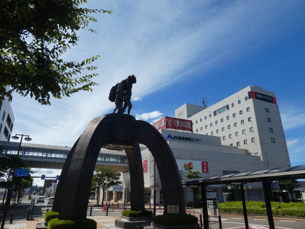![]() 鶴岡駅前「いなほを担ぐ人の像」 |