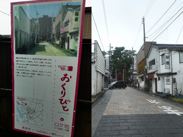 相馬楼などの先に映画おくりびとのロケで使用された石畳の道。突き当りに日枝神社の鳥居が見える。 |