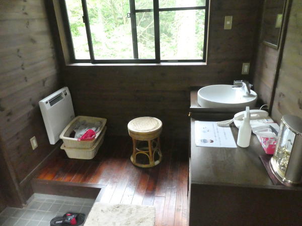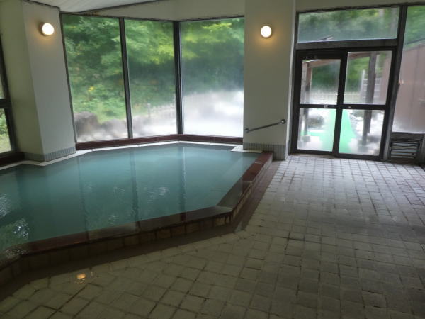 お風呂の窓は完全に吹き抜けで仕切りがない。 前は深い森の中で野趣満点だが、クマやシカが出てきそうな場所。しかし大浴場の閉鎖的な感じからすると余程ましで温泉気分満喫できた。 |