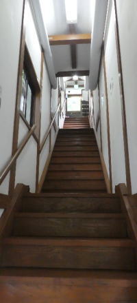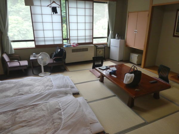 チェックインして4階の部屋へ。 暖房機だけ、クーラーの設備がなく扇風機だけだが充分涼しい。 |