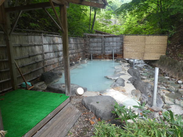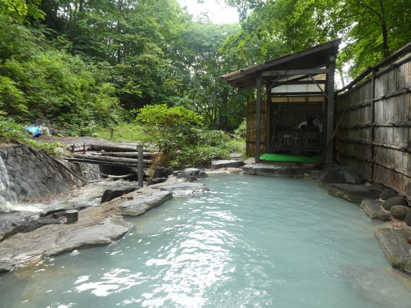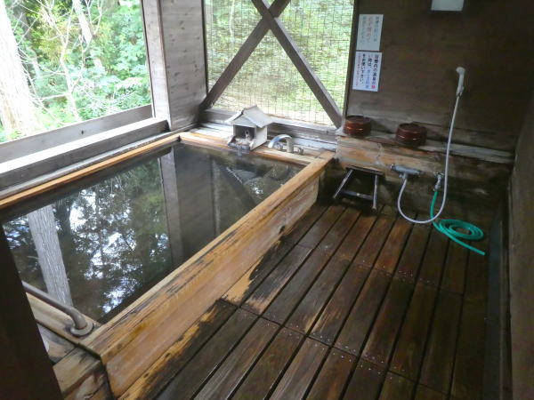 手前が男性用、奥が女性用。簡単な脱衣所があるだけで、洗い場もなく、湯桶でお湯をかけて入る。 源泉100%かけ流しで乳白色のにごり湯。 鹿やクマでも出そうな野趣満点の湯 |