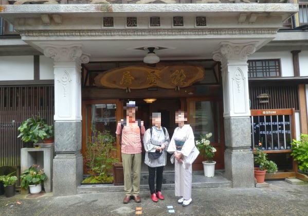 朝送迎バスを待つ時間コーヒーを飲んで休憩していると、女将が来て挨拶される、昨夜の中居さんから何か聞いていたのか、銀山の工夫だった祖先から現代にいたるいきさつなど丁寧に話されていた。 玄関まで見送られ写真を勧めれられ義理の一枚。 |
