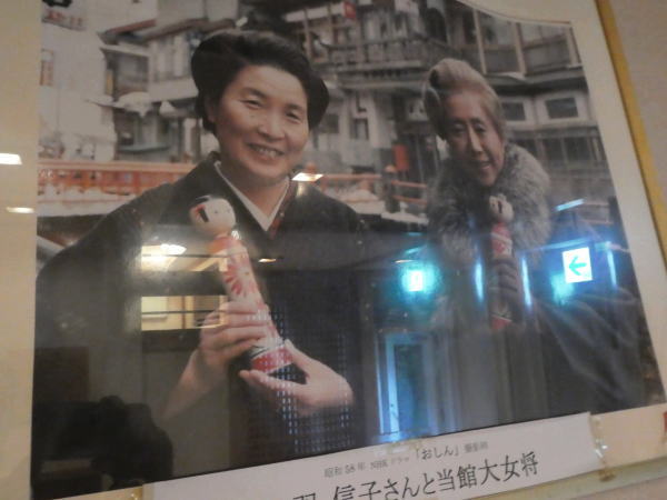 おしんのロケにも使われた宿。 「おしん」役の乙羽信子さんと先代女将の写真がロビー脇に掲示されている |
