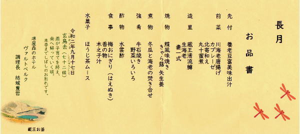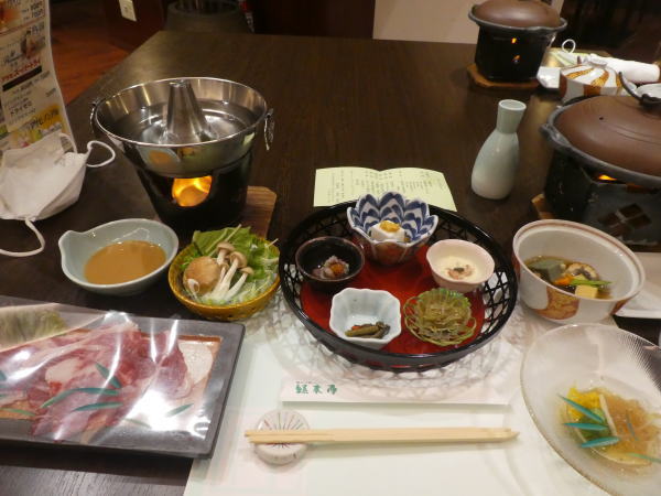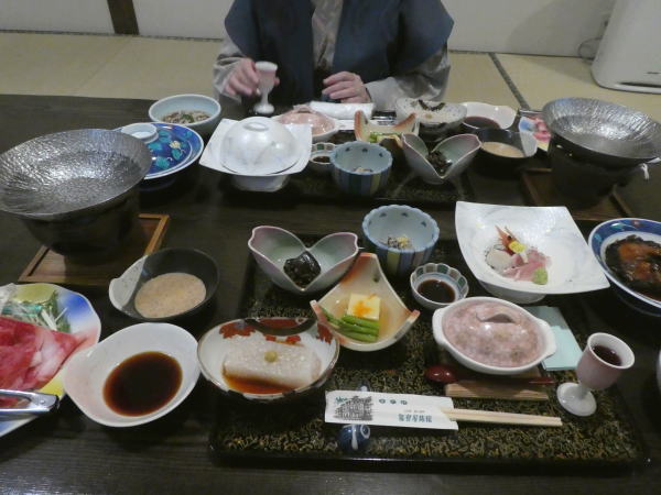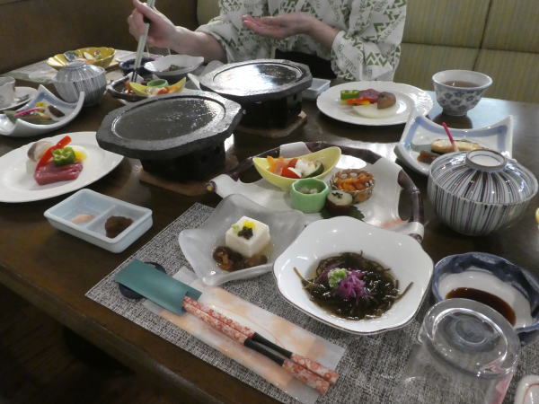 夕食は18時から一階レストランで。5〜6組のテーブルでコロナの時期で苦労しているのが感じられる。 ここは二人で一泊二食付き22000円格安だが、ここの倍以上の値段もする銀山の能登屋などに比べ、接客する女将さんの心遣いや、心のこもった料理が嬉しい。 |