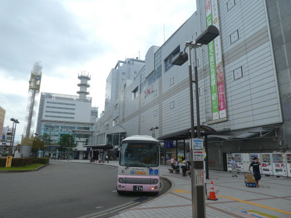 山形駅前から蔵王温泉行のバスは13:20。駅ビルの商店街などひやかしながら待つ。山形は果物の宝庫新鮮で安くMはいっぱい買って帰りたいというが旅の途中で無理。 |