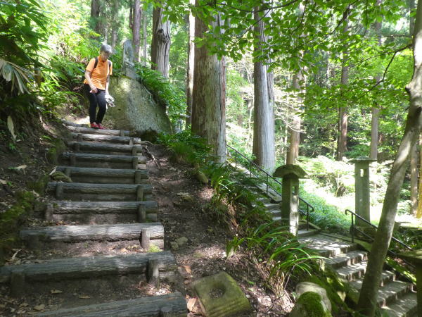 参詣道は良く整備されている石段を登る。マスクをしているので暑さで息苦しく、あごに下げた人も多い。 |