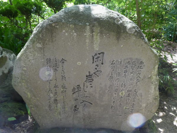 像の前に「閑さや岩にしみ入る蝉の声」の句碑 |
