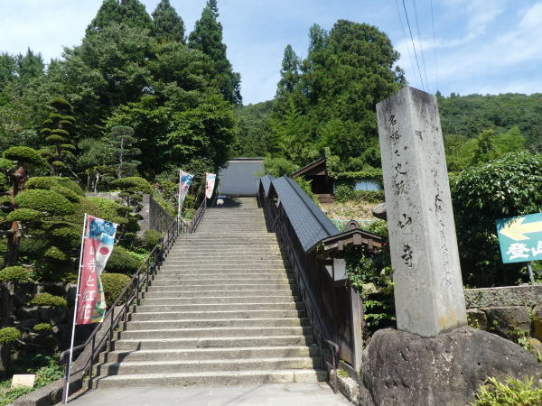 下から山の中腹に山寺の姿が小さく見える。石段の登山口から参拝登山開始 |