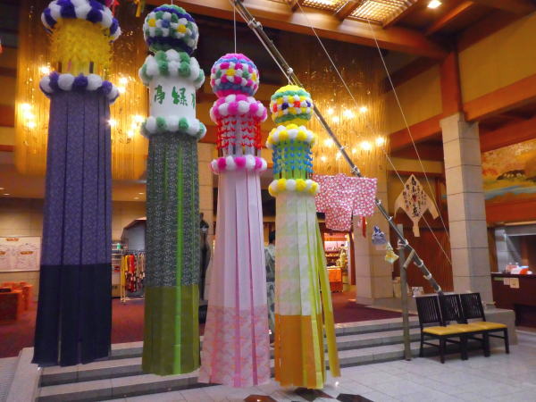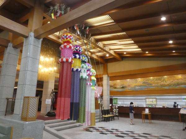 迎えの車はすぐにきてくれ、ほんの5分くらいで緑水亭に到着。 立派な七夕飾りのあるロビーでチェックイン。 |