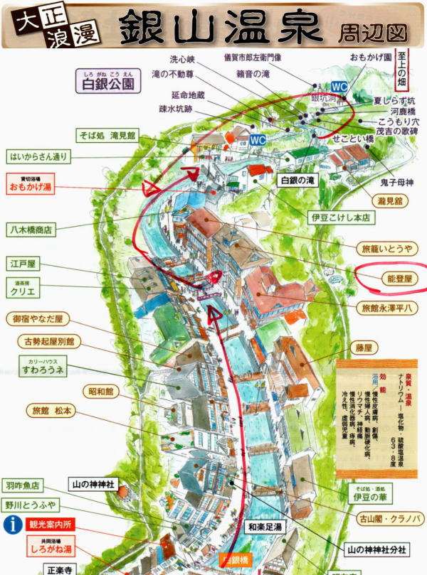 銀山温泉街歩き 能登屋 白銀の滝 延命地蔵 温泉街 |