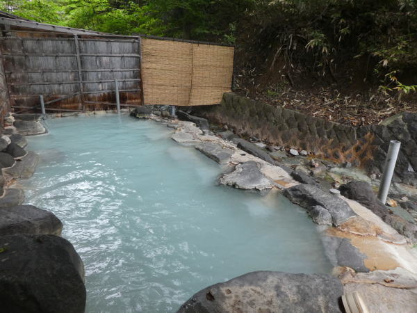 こっちも誰もいない貸し切り状態。源泉かけ流しのにごり湯は素晴らしい! 蔵王はスキーだけではないんだと再認識。 |