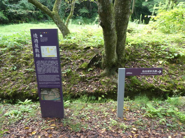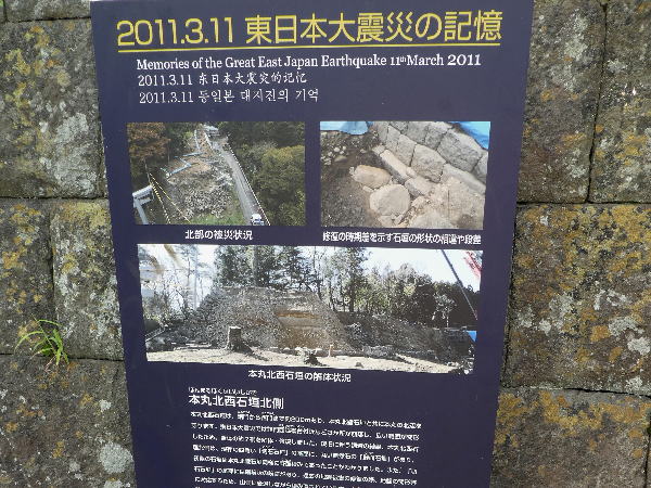 仙台城跡あちこちに見える東日本大震災の記録パネル。城跡も大きな被害を受けていた。 |