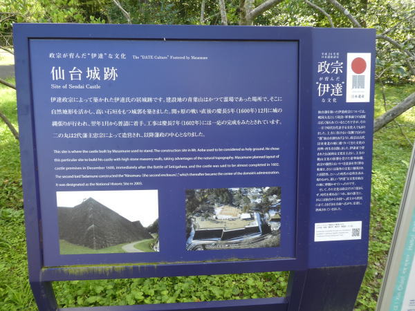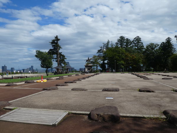 伊達政宗公騎馬像は昭和10年(1935年)伊達政宗の300回忌を記念して作られたものだが、第二次世界大戦中の金属類回収令のため供出されてしまうが、昭和39年(1964年)保存されていた型を使って現在の形に再建された。伊達政宗公騎馬像の前に立つと、天下取りの野望に燃えた伊達政宗と同じ視線で市街を展望できる。 |