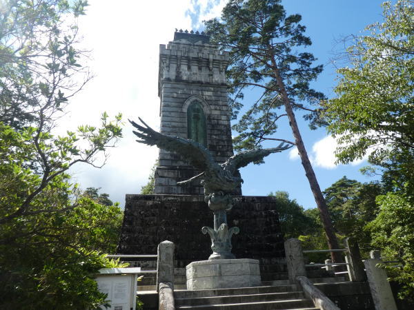 仙台城本丸跡にある「昭忠碑」1874年佐賀の乱〜西南戦争〜日清戦争などに従軍した戦没者の慰霊碑。大きく広げる翼は鷹ではなく「とんび」以前は碑の頂上にあったものが、東日本大震災で落下し地上に設置されている。 |