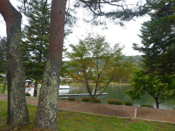 蓼科湖に到着、湖畔を歩いて対岸へ。 正面にリゾートホテル蓼科、晴れていれば遠くに蓼科山と北横岳が控えているはず。 |